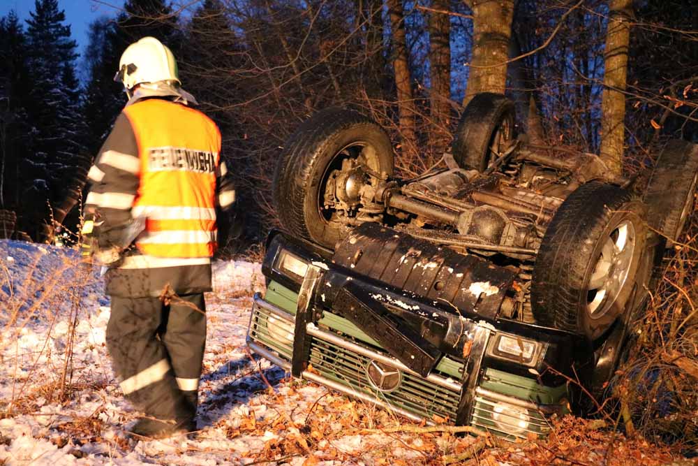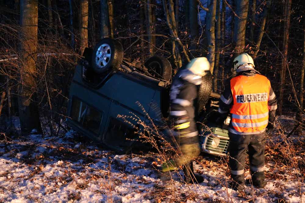 Am frühen Dienstag Morgen des 17.01.2017 kam ein in Richtung Feldbach fahrender PKW im oberen Bereich der B66 „Kornberger Leitn“ zwischen Feldbach und Riegersburg von der Fahrbahn ab und blieb am Dach im angrenzenden Waldrand liegen. Der sofort verständigte Rettungsdienst lieferte den männlichen Fahrer, welcher sich allein im Fahrzeug befunden hatte, ins LKH Feldbach. Die Feuerwehren Schützing und Feldbach führten mit 15 Mann gemeinsam die Bergung des verunfallten Geländewagens mittels Kran durch.