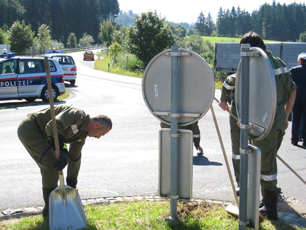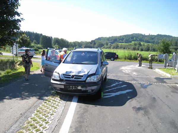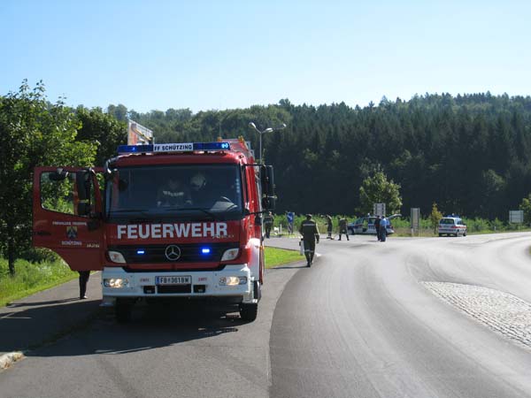 Verkehrsunfall auf der B66 bei der Kreuzung nach Auersbach. Ein PKW-Lenker der nach Auersbach links abbog übersah vermutlich den entgegenkommenden Motorradfahrer. Der Motorradfahrer prallte gegen die Front des PKW’s und wurde unbestimmten Grades verletzt und von der Rettung ins LKH-Feldbach gebracht. Unsere Feuerwehr sicherte die Unfallstelle ab und säuberte sie von Ölspuren.